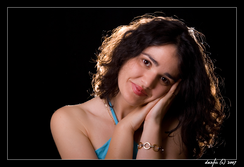 Tecnicamente non è male, bella la luce dietro i capelli, buona davanti ma dovrai fare di più sulla prossima... per esempio una luce un po' più morbida usando o due fonti luminose o un pannellino riflettente!