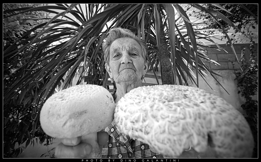 i funghi in primo piano sono sfocatissimi: eppure hanno una texture bellissima che poteva andare a braccetto con il viso rugoso della simpatica "cercatrice".