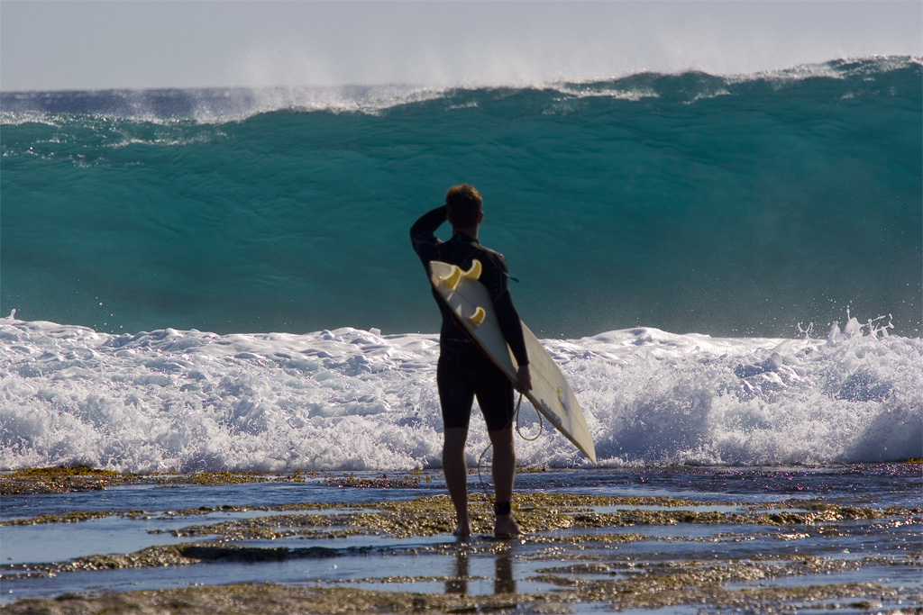 Il surfista è stato sulla riva per più di 10 minuti a pensarci in quanto dove vedete la schiuma dell'onda precedente ci sono rocce e coralli.... non proprio un posticino sicuro per surfare.