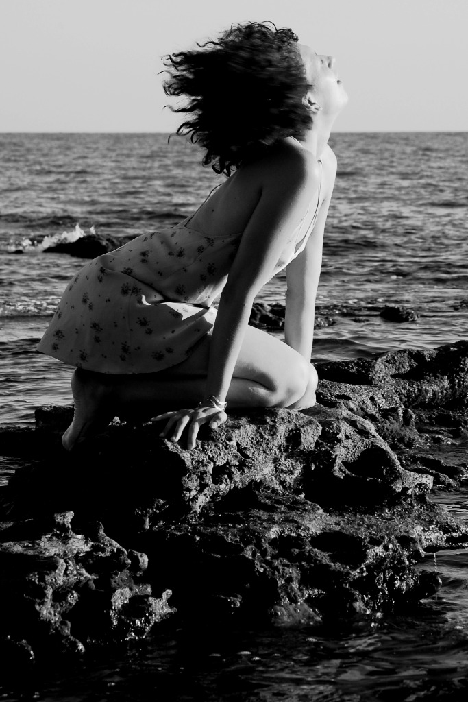 Mi piace molto che ci sia una sorta ci coincidenza tra la direzione della luce e quella del vento: il b/n ben contrastato ci restituisce con efficacia il calore di questa luce che pare investire come un'onda il corpo della modella e penetrarne la pelle, amplificata e resa quasi concreta dall'effetto del vento che, nella stessa direzione, scompagina i capelli.