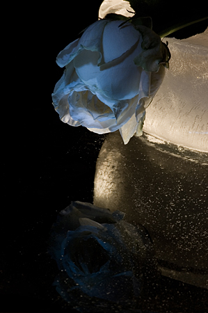 Si, è una rosa appoggiata a del ghiaccio, il tutto appoggiato ad una lastra di vetro. Man mano il ghiaccio si è sciolto e ha creato uno strato d'acqua sul vetro (oltre che sul pavimento ) che con la luce che arriva dal basso ha prodotto questo strano effetto.