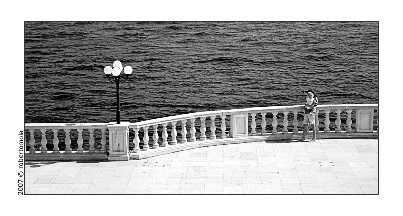 Taglio panoramico, bianco e nero e composizione essenziale, con il soggetto (i soggetti) sulla destra che viene bilanciato dal lampione.