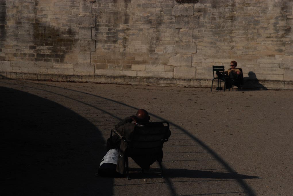 Più che una pausa, la leggo come un "Mezzogiorno di fuoco" tra due desideri pigri, in attesa di un'azione, chi cederà per primo/a lasciando il riparo della sedia per presentarsi all'altro/a?