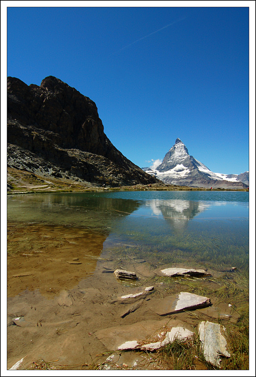 Veramente bella.... mi piace come l'hai composta... con un bel primo piano sassoso che scivola nel verde dell'acqua ricco di riflessi.... e con la due cime che si susseguono in diagonale, una brulla e l'altra innevata...... la tua solita lucentezza di immagine.....