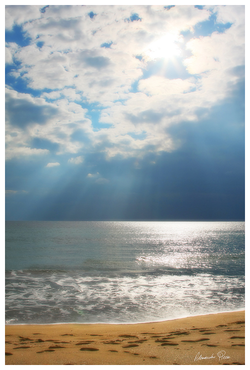 Bellisima. Una luce quasi divina e il mare che sembra argento. Ma i raggi di luce sono veri o è PW. Peccato per i bianchi bruciati delle nuvole.
