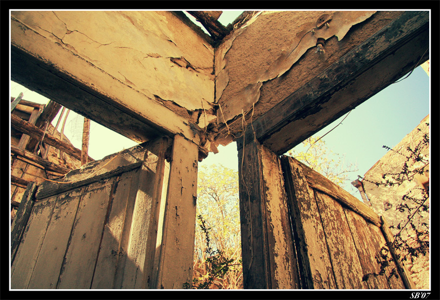 Riesce a far vedere le due porte differenti ma entrambe distrutte dal tempo, spalancate verso l'esterno.. per me un pò è penalizzata, anche aiutata dal titolo, dalla poca visione della mancanza del tetto, anche se si intuisce dall'asse verticale che manca, e che fa capire la desolazione del posto, e quello spicchio in alto mancante, del tetto vero e proprio..
