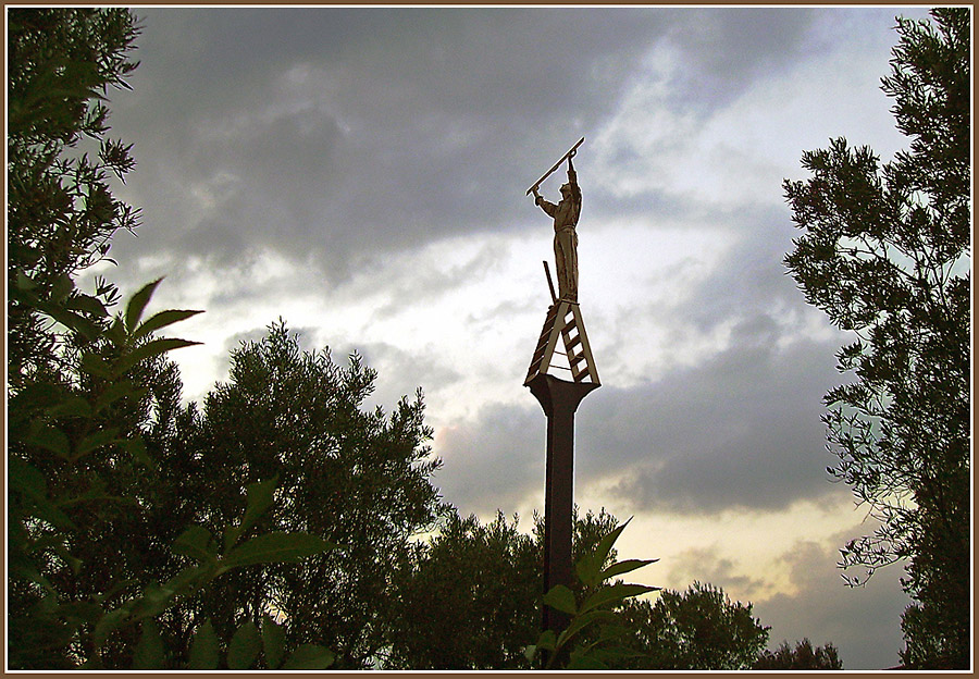 Scattare un pò più a sx non era possibile perchè cespugli ed alberi non permettevano una buona visuale. Ho fatto qualche scatto quasi di fronte alla scultura, ma non sono riuscito ad ottenere un buon dettaglio del volto. Ho creduto che fosse meglio inquadrarlo in modo tale da far vedere il profilo in controluce.