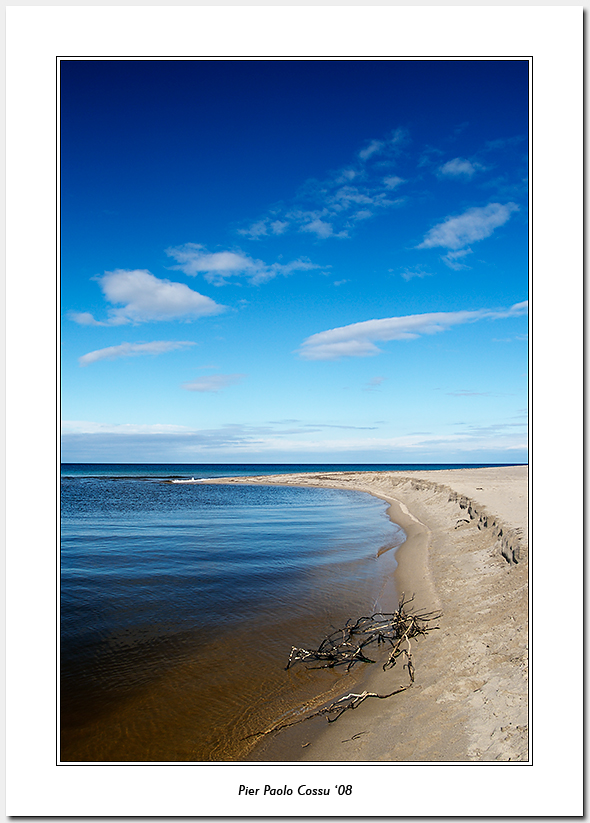 Molto bella, Pier Paolo, colore o bn che sia, le tue foto sono davvero incantevoli. In questa foto la pulizia del blu intenso del cielo che si specchia nel mare è esaltato dal bianco delle nuvole e della spiaggia. Bello anche il groviglio di rami secchi che conferisce alla scena profondità.