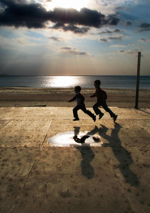 veramente splendido questo scatto..ottima la composizione e i colori..il momento colto poi, con i due bambini che corrono in sincrono rende l'atmosfera molto allegra e spensierata.