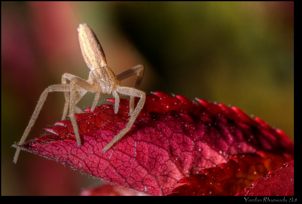 Il ragnetto contrasta ottimamente con il rosso della foglia, bello anche lo sfondo!