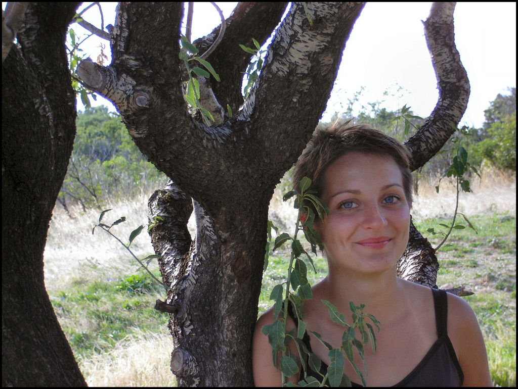 vorrei soffermarmi, in maniera scherzosa, sulla posa: è un classico, specie per chi è alle prime armi, far appoggiare la propria modella contro un albero. retaggio di vecchie foto, chi lo sa... o forse è semplicemente la prima cosa che viene in mente di fare.