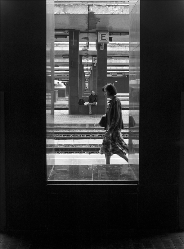 ..è la donna l'unico elemento dinamico..vada benissimo così il mosso in un risucchio statico ultra geometrico dato dai piani in scansione delle colonne che portano lo sguardo in profondità..