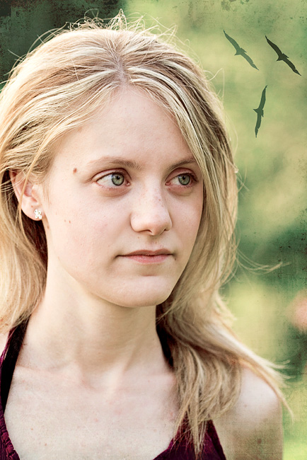 Il vestito bordò appena accennato sulle spalle della ragazza esalta il colore candido e chiaro della sua pelle nonché dei suoi occhi. Quest'ultimi richiamano armoniosamente lo sfondo che ci proietta in una dimensione immaginaria....sembra quasi di osservare un quadro