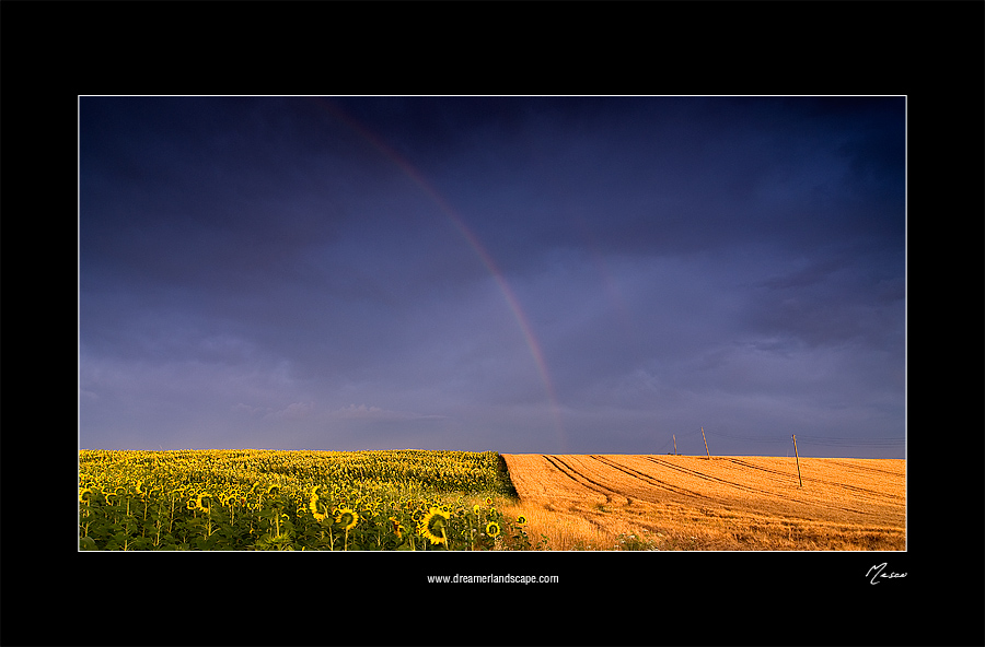 E' meraviglioso questo campo suddiviso nettamente in due parti e sormontato dal'arcobaleno.