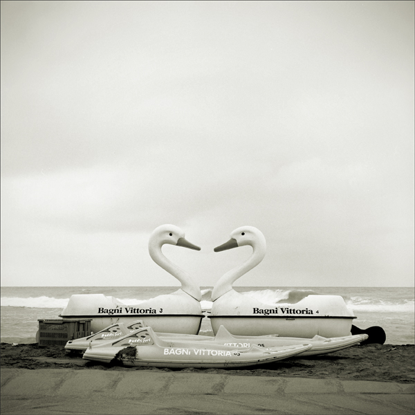 | Gran bella foto. Sembra una foto semplice ma io vi vedo una grande cura in ogni particolare: la linea dell'orizzonte che coincide con l'attaccatura del collo dei cigni e quella delle onde, i solchi sulla spiaggia e quella leggerissima vignettatura in alto quasi a chiudere il cielo.