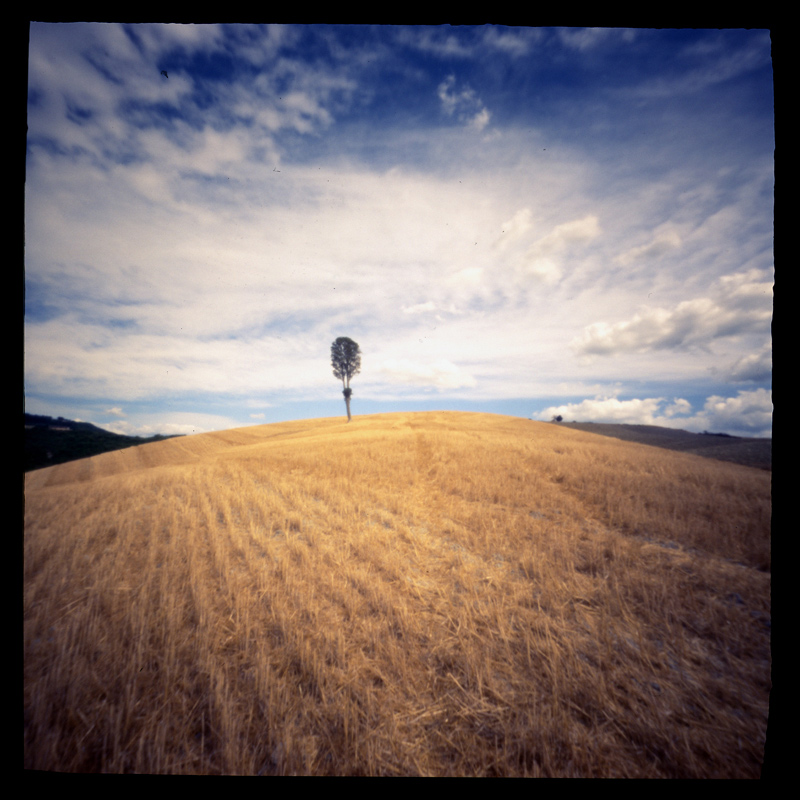 La definizione così particolare della scena, questi colori quasi soft, con la poca ma incredibile poca brillantezza del tutto, rende la composizione molto magica.. mentre tutte le linee sul terreno e quel disegno di nuvole nell'aria quasi portano lo sguardo diretto verso l'unico elemento verticale, quell'albero al centro.. aiutato dall'effetto vignettatura che si è creato..