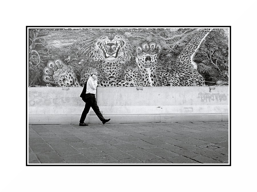Lo scatto vive del contrappunto fra la ferocia del felino rappresentato nel murales e l'ordinaria tranquillità del tipo.