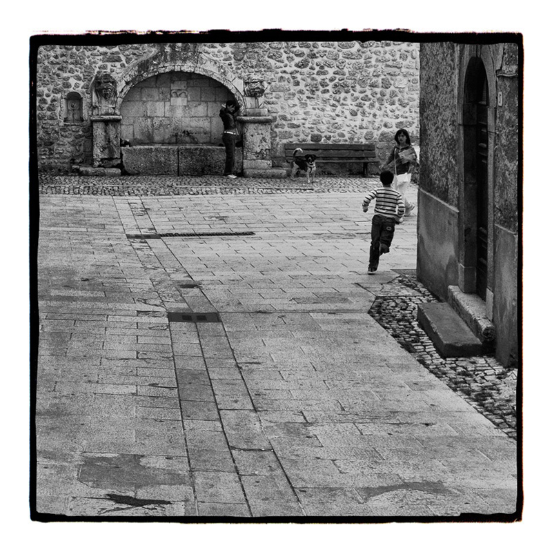 E' una semplice scena urbana in cui viene colto un bambino (in "bianco e nero") che corre, colto poco prima che giri l'angolo e questo mi emoziona; mi emoziona averlo ripreso in luogo storico - fotografico [vedi Bresson, Bauer, Giacomelli, Berengo Gardin e tanti di noi altri] che è la "fontana del Pisciarello" che in questo caso rappresenta proprio il fronte del palco teatrale visti anche gli altri attori, cane compreso, in cui tutto si ferma e rimane il puerile dinamismo; è tutto così pittoresco.