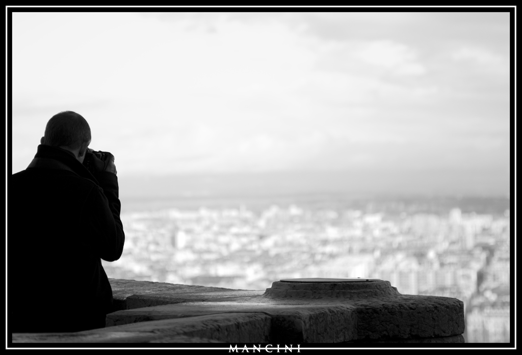 Diciamo che innanzitutto sono rimasto colpito dal personaggio: quel piazzale è un posto molto panoramico e sempre affollatissimo di turisti. In una bella giornata lo sguardo spazia davvero tanto, con la città tutta ai piedi. In mezzo a mille persone anonime quell'uomo scuro con cappotto guanti e macchina nera nell'angolo del parapetto mi è subito saltato all'occhio. Solo in un secondo momento mi sono accorto dell'esteticità della scena: il parapetto spezzato a fare da siepe leopardiana, lo sguardo verso l'infinito chiuso dalla ridotta pdc, l'atteggiamento un filo vanesio del soggetto, l'eleganza del tutto. Con questa seconda idea ho scattato. Un solo scattopurtroppo, perchè poi il resto dei turisti ha invaso anche quell'angolo...