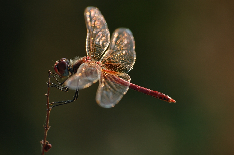 Noto una maf selettiva sulla testa e corpo della libellula. Le ali sono in parte a fuoco, deduco quindi che chiudendo di più il diaframma avresti ottenuto una maggior visibilità delle stesse. La maf è precisa ed il soggetto parallelo alla fotocamera. Per la composizione un filo d'aria in più avrebbe giovato. Per i colori leggermente scuri, pur avendo margini di elaborazione in post, penso che tu l'abbia voluti così. Complessivamente immagine molto valida.