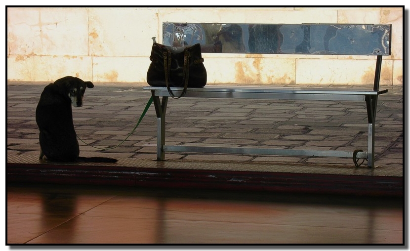 Secondo me il cagnolino faceva un po' l'offeso per essere stato legato alla panchina, ma non troppo per non seguire con lo sguardo la sua padrona. Questo era il motivo del forse infelice titolo.  |