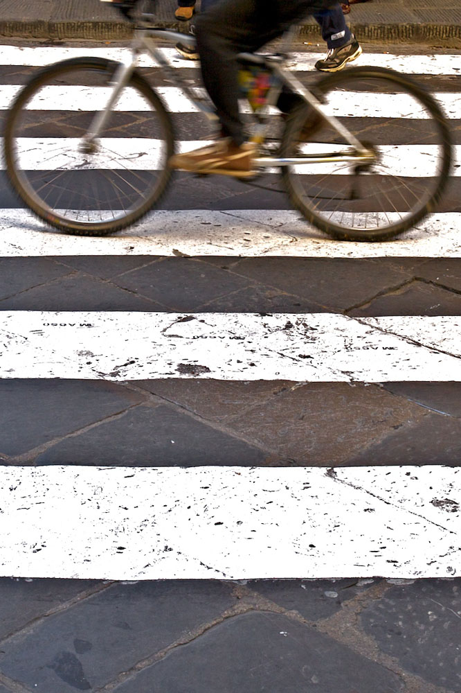 Il taglio e la sovraesposizione delle strisce pedonali eliminano spazialità e prospettiva (a parte il taglio in alto, che include elementi di disturbo - piedi sul marciapiede, quel dettaglio sopra al manubrio), costringendo l'occhio in uno spazio ristretto, e portandolo a sovrapporre quel piede di destra alla ruota posteriore della bici. L'effetto di compressione esasperata delle distanze, tuttavia, evidenzia alcuni elementi di disturbo.