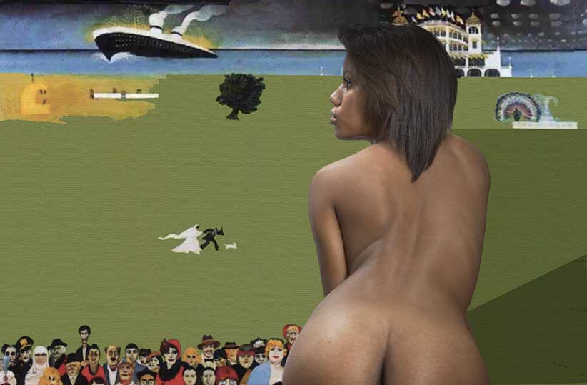 lo sfondo è composto da tutti gli elementi della locandina del film Amarcord .. compreso il transatlantico Rex che va a 3000 nodi verso la spiaggia Smile la modella è inserita come un "Amarcord", che deriva dalla voce in dialetto romagnolo "a m'arcord", ossia "io mi ricordo .... forse la modella rappresenta soprattutto i giovani del paese, adolescenti presi da una prepotente "esplosione sessuale" come da trama del film o forse non ha nessun significa o non è al suo posto, oppure è semplicemente volgare..... il consiglio che chiedevo è più tecnico.... come rendere la modella più omogenea nel contesto senza dover utilizzare una immagine vettoriale