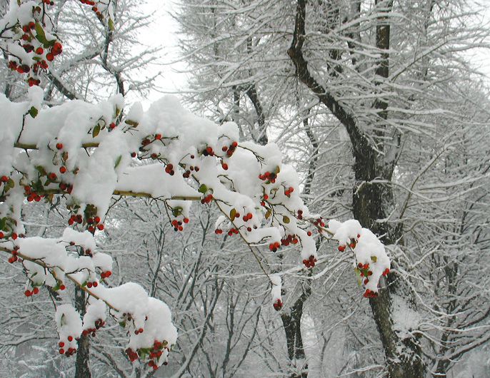 Molto bello il contrsto delle bacche rosso, sotto la neve e il grafismo degi alberi di sfondo  |