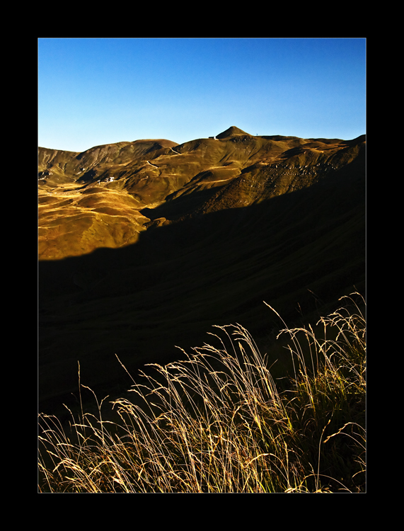 Un taglio indovinato a mio avviso. Fatto apposta per mettere bene in risalto i tralci d'erba ben illuminati in primo piano contro la zona ombrosa della prima parte della vallata, che pur in ombra, cosa importante, si legge comunque. La foto poi mantiene una discreta definizione di dettagli anche sulla zona più lontana dove in genere con una messa a fuoco così ravvicinata ci si aspetta una certa caduta di purezza di dettagli. Segno che hai sfruttato una forte chiusura di diaframmi.