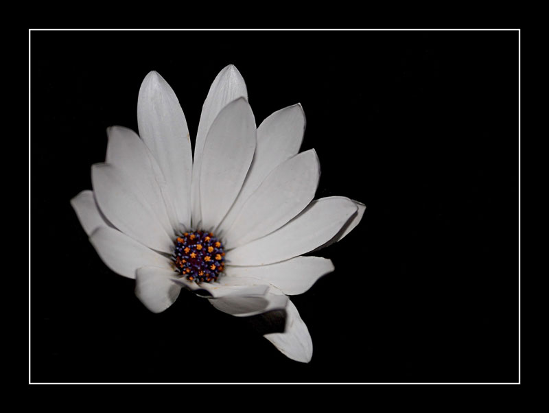 Bella la composizione con il fiore decentrato sulla sx, ottimo anche lo sfondo nero, un piccolo intervento sul bilanciamento dei colori per correggere la tonalità del bianco e la foto è perfetta .