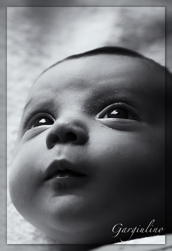Mi piace, il bimbo è da mordere nelle guanciotte ma credo che la conversione/viraggio non gli renda giustizia e anche una schiarita gioverebbe, proverei a riconvertire; cornice e firma sull'immagine non sono il massimo a mio parere se le vuoi mettere forse è meglio firma su cornice esterna all'immagine, anche questo un parere.