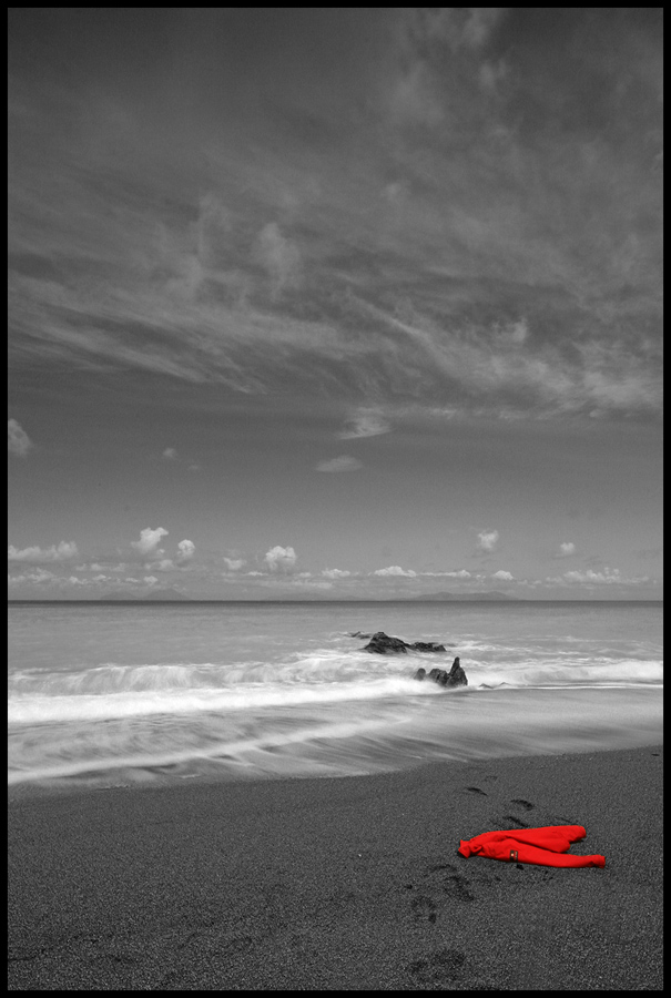 I toni bassi del bn, la spettacolarità di cielo, il respiro del mare, tutto fa si che l'indumento rosso, collocato in un punto forte del fotogramma, attiri l'attenzione.