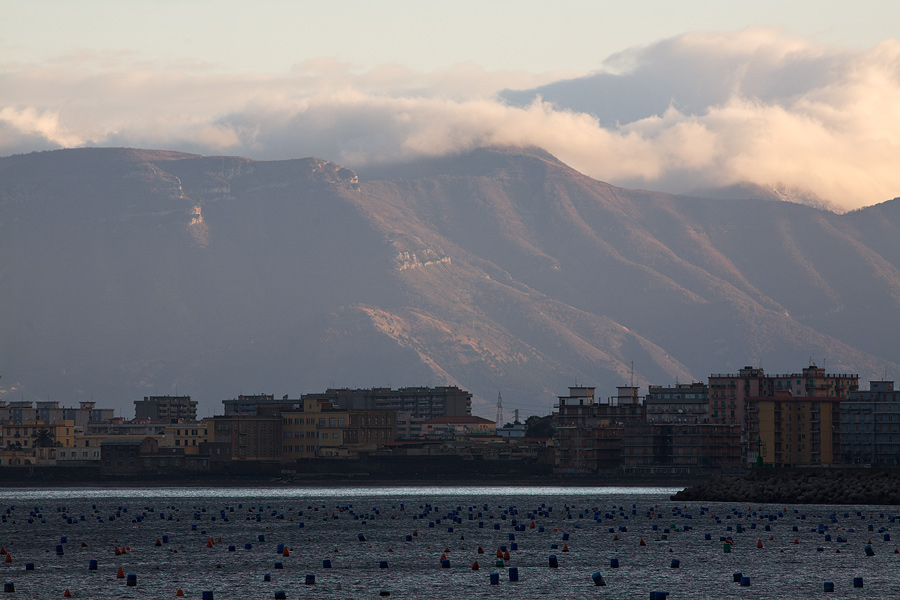 | L'elemento centrale della foto è il raggio di sole sul mare che sembra sottolineare l'abitato, il problema è che questo raggio distrae e non valorizza, vi sono elementi nella foto che avrebbero dovuto essere maggiormente in rilievo, proverei in PS ad aumentare l'intensità per provare a rendere più incombenti i colli sullu sfondo. |