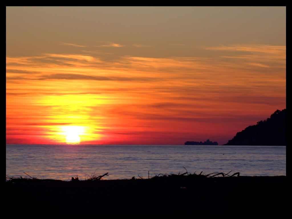 | Un tramonto infuocato, interessanti i colori del cielo, la composizione segue perfettamente la regola dei terzi ma manca di profondità. |