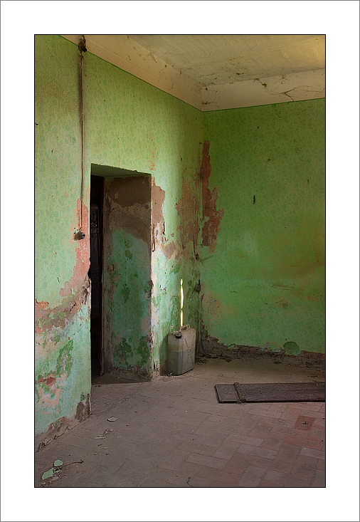 la luce soffusa ma decisa sottolinea la bellezza di questo verde e dei grafismi del muro di un verde leggeremente più scuro. il tutto fa ricordare una antica bellezza di una ambientazione contadina ahimè decaduta ed abbandonata.
