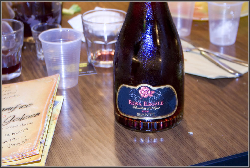 Ti do qualche indicazione io: innanzitutto il flash ha appiattito la scena creando anche un riflesso blu sulla bottiglia e su diversi bicchieri. La composizione è poco curata - se volevi rappresentare la bottiglia di brachetto ti dovevi concentrare su quella lasciando in secondo piano i bicchieri. Poi ci sono diverse parti tagliate sia a destra che a sinistra e naturalmente anche la bottiglia è tagliata