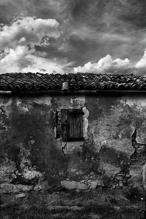 Tutto vuole attirare l'attenzione in questa fotografia. Le nuvole, il muro screpolato, il tetto con le sue geometrie scomposte...il tutto condito con un ottimo B&W.