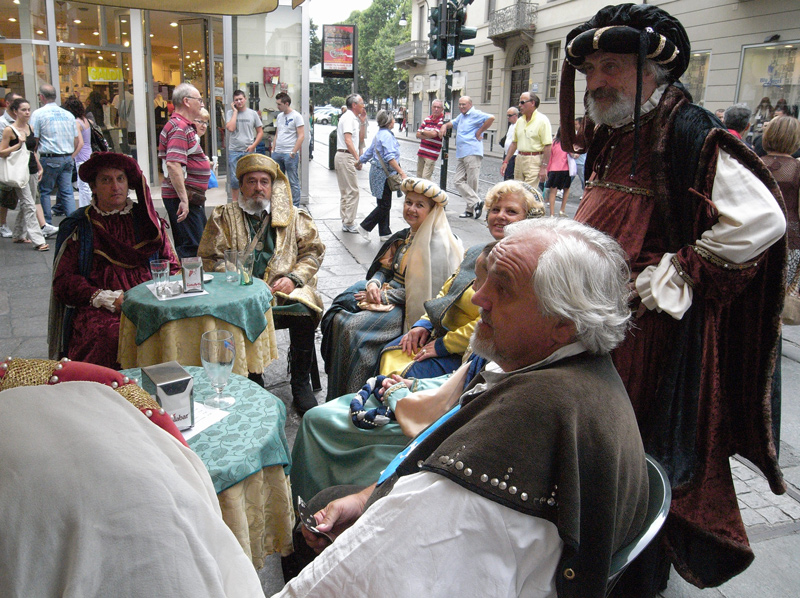 Una scena insolita quella che presenti: un aperitivo dei giorni nostri ma con i protagonisti in vesti medioevali. E intorno a loro gira la normale vita quotidiana, frenetica e apparentemente confusa dove gli uni appaiono indifferenti agli altri. Mi piace la fusione ironica dei due mondi temporali accentuata dagli sguardi divertiti dei due uomini sullo sfondo appoggiati al lampione. Gli sguardi in camera di alcuni attori non disturbano più di tanto. Non era facile congelare questa complessità in un fotogramma pulito e invece ci sei riuscito avvicinandoti ai protagonisti in maniera funzionale.
