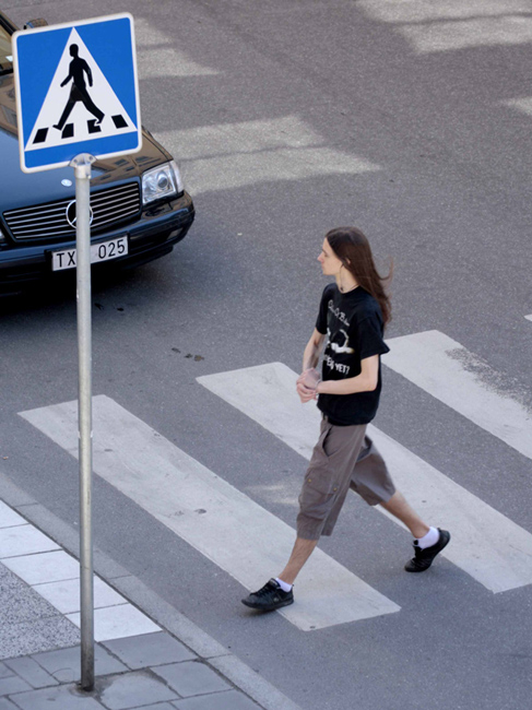 Non mi sembra un momento tanto irripetibile..Potresti rifare lo scatto catturando un contesto migliore senza elementi di disturbo (probabilmente impiegheresti pure meno tempo di un lavoro fatto accuratamente con il timbro clone e ti senteristi a posto con la coscienza trattandosi di una street !!!). Cerca di riprendere ugualmente quei riflessi in alto , che riprendono la forma rettangolare delle strisce, ed ovviamente lo stesso passo del soggetto.