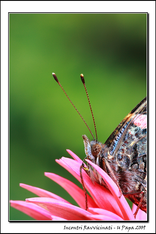 L'idea originaria era di tagliare ulteriormente la farfalla e posizionare l'occhio all'incrocio dei terzi, poi ho preferito tenermi più largo e includere nel fotogramma anche la zampetta in basso a destra... ed è venuto fuori così!