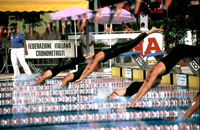 Magari si poteva scattare mettendosi proprio in parallelo ai nuotatori e schiacciandoli, con la profondita di campo, tutti su uno stesso piano avrebbe fatto saltare fuori qualcosa di interessante tipo una massa nera data dai costumi con braccia, teste e piedi che da questa massa nera emergono...qualcosa forse di non strettamente sportivo.