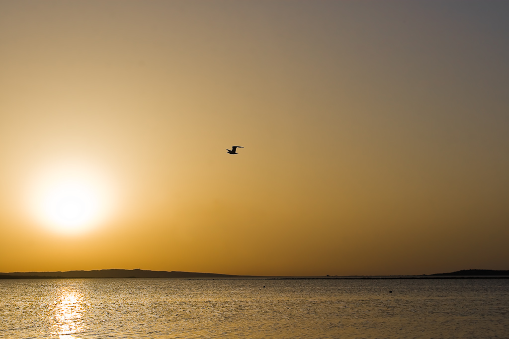 hai ben gestito un tramonto col sole ancora abbastanza alto, ma forse il cielo ha troppo spazio in questo scatto, che resta comunque molto piacevole ed impreziosito dal gabbiano