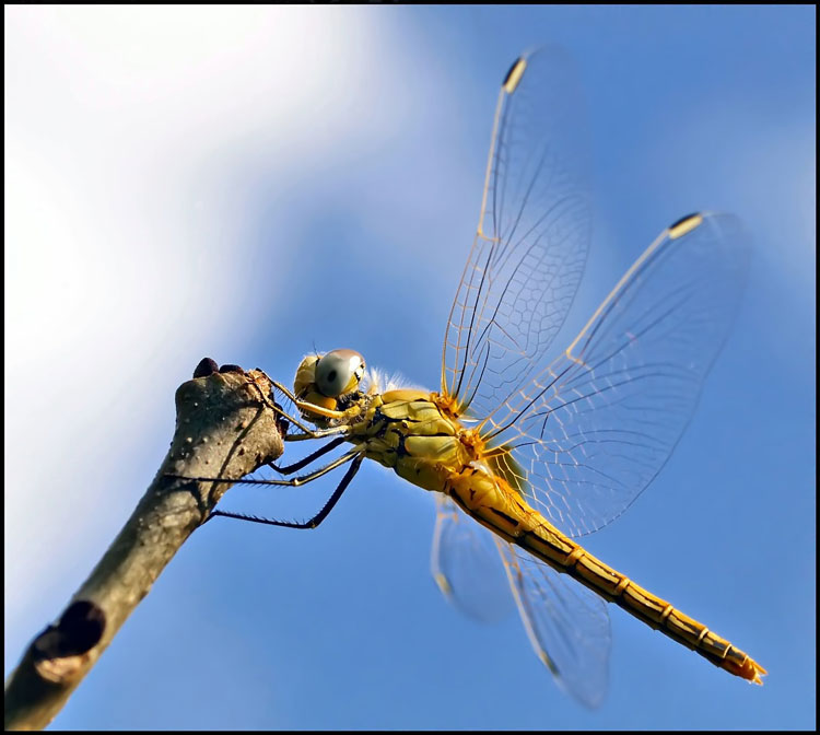Dal momento che le libellule hanno l'abitudine di tornare sul ramo da dove sono partite per cacciare qualche moscerino, ti conveniva cambiare angolazione per non riprendere quella zona di cielo eccessivamente bianca ed utilizzare anche un diaframma 11 o 13 così da aumentare la pdc. La composizione è equilibrata.