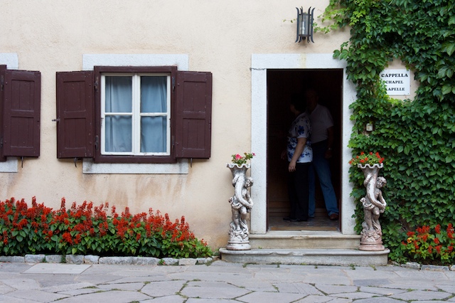 Ho scattato questa fotografia perchè ho visto una composizione interessante con i fiori, la porta, le statue e le due persone parzialmente nascoste.