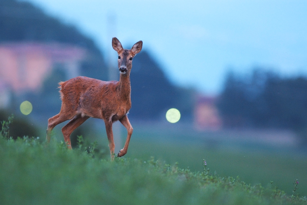 Ogni tanto mi viene voglia di provare posti nuovi, in questo caso è da quando osservo la zona da lontano con il binocolo che noto un discreto traffico (riserva)mi ero piazzato a ridosso di un cespuglio di rovi, alcuni si sono presentati sul fianco ma prima di uscire fecero dietro front (strano peccato perchè erano a pochi metri, ho solo potuto guardarmi la scenetta) altri che erano usciti piu' sotto erano tranquilli, questa femmina era uscita dal bosco al di sopra... la posizione a priori non era delle piu' felici, prato in pendenza quasi in cima, con la vallata di fronte/sotto; infatti è stato curioso vedere che c'era una fascia di circa 20/30 gradi in direzione della brezza (discensionale) in cui quando passavano storgevano il naso,diventavano irrequieti e dopo pochi minuti se ne andavano (chissà perchè ) anche questa difatti quando piano piano pascolando è scesa ha fatto la stessa cosa.