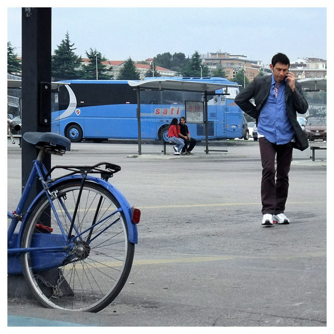 Io non ci vedo solo l'azzuro: vedo pure dei rossi zampillanti nell'intera foto e mi piace. Un gioco cromatico per queste tre attese: la coppia alla fermata, la bici parcheggiata in pp, l'uomo al telefono, in andatura nevrotica, con una faccia delle non più entusiaste..