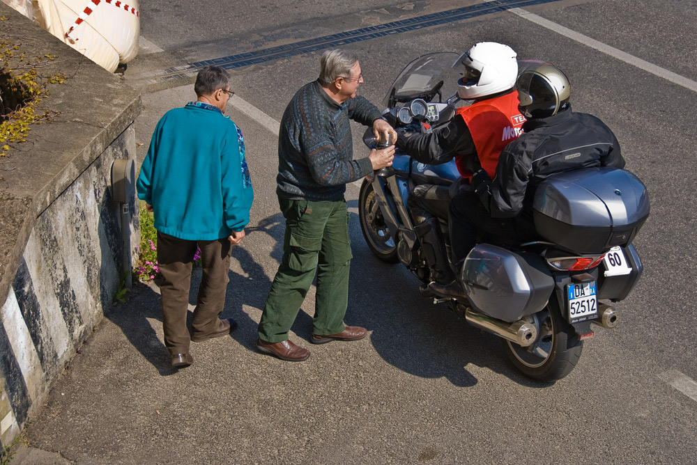 ricorda che sei penalizzato dal tuo punto di ripresa, dall'alto in basso,un punto di vista diverso, valido in quanto fine a se stesso, e non già errato o sorprendente. Ciò non toglie nulla però al valore delle nozioni espresse poco sopra, che hanno una validità oggettiva, sicura e comprovata è molto vojeristica, fa pensare immediatamente a una storia molto particolare, per poi scoprire che i motociclisti si son fermati solo per dare un saluto a qualche conoscente.