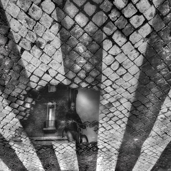 Un fotogramma originale nella composizione dove si completano in armonia la componente figurativa insieme a quella plastica. Lo squarcio di vita cittadina prende vita dalla texture plastica dello sfondo, richiamando la forma stessa dei sanpietrini. L'osservatore è piacevolemente attratto da quella porzione di vita, dal suo contenuto trasparente, apparentemente in contrasto con i confini sfumati e frastagliati di quella cornice voluta e cercata, vaga e indistinta, rappresentata dal riflesso della pozzanghera. La presenza umana si confonde leggermente con l'architettura urbana retrostante: forse l'attendere il passaggio della sagoma fino all'attimo che lo avrebbe staccato dallo sfondo avrebbe permesso una maggiore leggibilità.L'immagine plastica oltre il riflesso appare fortemente strutturata: il monocromatismo e l'alternanza del bianco e nero crea delle bande con andamento rettilineo, divergente dalla base del fotogramma che si completano in un sistema alternato pieno-vuoto-pieno-vuoto che ricordano l'alternarsi dei fotogrammi in una pellicola cinematografica oppure le sequenze di un fumetto; la stessa texture quadrata dei sanpietrini richiama questo significato semisimbolico e lo lega ancor più efficacemente al riflesso incorniciato.