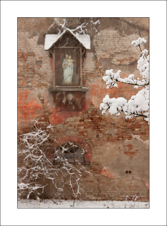 E bella. E' poetica per una sua lieve tenerezza, affettuosità, nel raccogliere questo elemento sacro nel contesto paesaggistico innevato di questi giorni. Il carminio che affiora fra gli intonaci vissuti a rende vivida la scena, e il bianco che si risponde da varie parti della immagine con armonia creano un classico della tua produzione ma particolarmente gradevole e sentito.