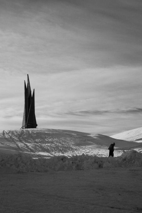 venendo alla foto purtroppo ti dico che non mi convince a pieno nella compo e nella conversione. Mi spiego: mi piace come i due elementi sono uniti dalle scie e dalle orme, ma la compo verticale relega queste due figure un po' troppo ai margini e vengono incluse parti abbondanti sotto e sopra che per me non arricchiscono la foto. Io qui avrei zoomato e inquadrato in orizzontale.
